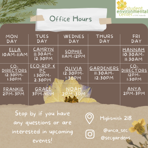 For inquiries about project ideas, event collaborations, green grants, and ways to get involved, email us at sec@unca.edu and one of our Co-Directors will be happy to get in touch.